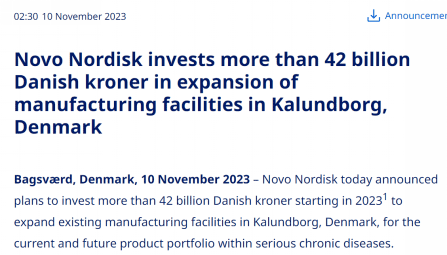 居高不下的市场热度与放量狂增的产品销售,正使司美格鲁肽面临肉眼可见的产能瓶颈,供货紧张的传闻令市场各方倍感焦虑。然而,诺和诺德宣布扩产计划,计划未来几年投资超过420亿丹麦克朗(约60亿美元),扩大其位于丹麦卡伦堡的生产设施,以满足GLP-1产品等慢性病系列产品的产能需求,此举再次点燃了市场热情。