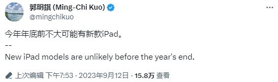 分析师郭明錤上月表示,今年底前不太可能推出新款iPad。
