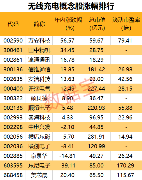 尽管部分公司半年报业绩不佳,但无线充电概念股整体表现良好。万安科技年内股价上涨达56.57%,田中精机涨幅也超30%,瀛通通讯、信维通信、安洁科技等涨幅超10%。