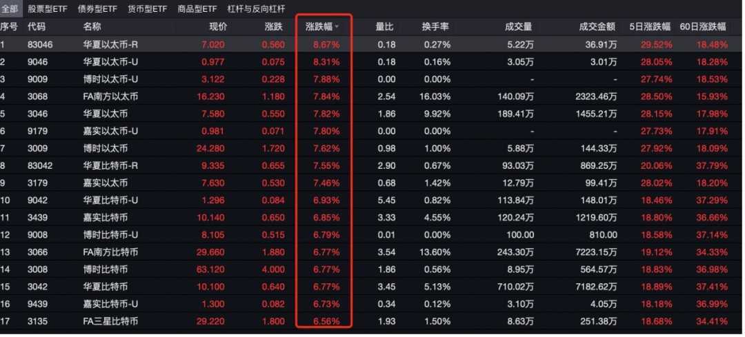 港股虚拟币ETF同样表现出色,单日涨幅最高超过8%