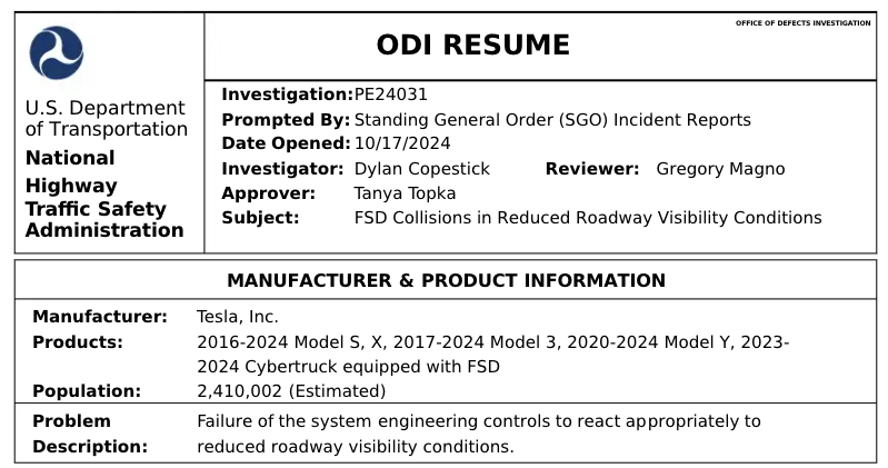 值得注意的是,此次调查涉及4起FSD启用期间的事故,其中一起事故造成一名行人死亡。
