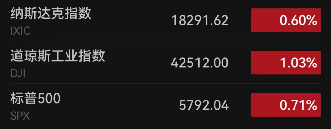 当地时间10月9日,美股市场迎来积极行情,三大股指集体收涨。截至收盘,道琼斯工业平均指数上涨431.63点,涨幅达到1.03%,报42512.00点;纳斯达克综合指数上涨108.70点,涨幅为0.60%,收于18291.62点;标普500指数上涨40.91点,涨幅为0.71%,报5792.04点,其中道指与标普500指数均创下历史新高。