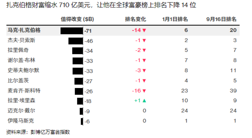 据彭博社报道,马克·扎克伯格因全力投入元宇宙项目,导致其财富大幅缩水。今年以来,扎克伯格身家已减少超过710亿美元,是彭博亿万富翁指数追踪的超级富豪中财富减少最多的一位。目前,扎克伯格的净资产为559亿美元,在全球亿万富翁中排名第20位,是自2014年以来的最低排名。