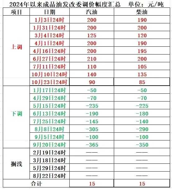 回顾2024年,国内成品油零售限价已经历21次调整,包括9次上调、8次下调和4次搁浅。涨跌互抵后,汽油、柴油价格累计均上涨15元/吨。