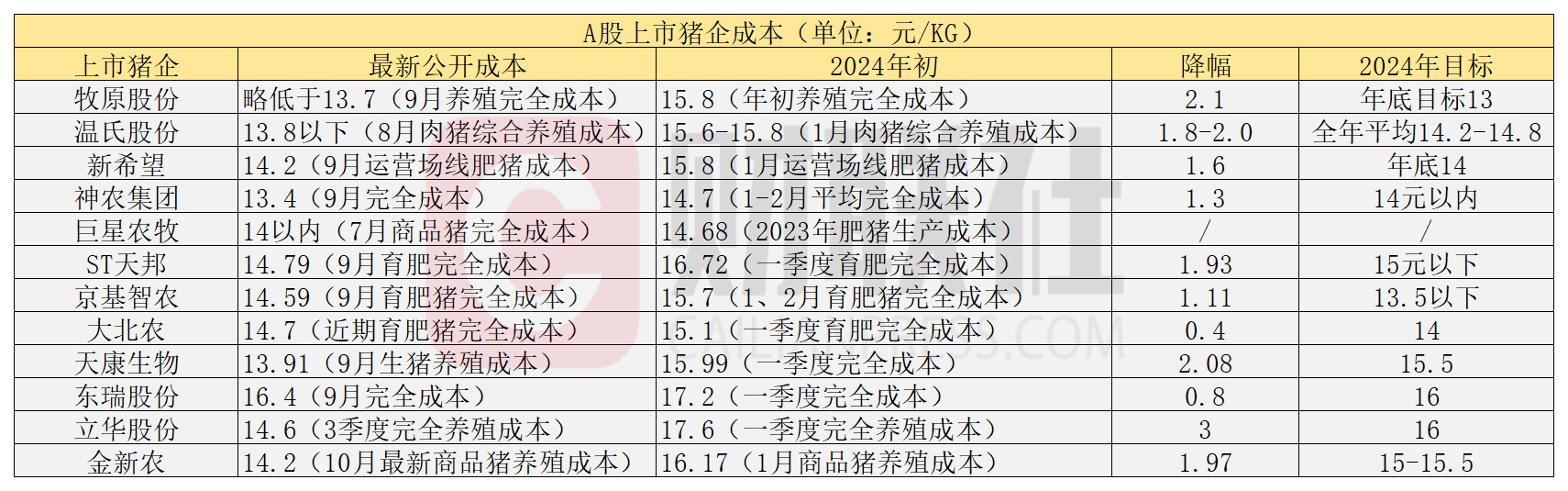 今年以来,A股上市猪企随着市场行情的回暖,业绩表现亮眼,前三季度合计盈利超过230亿元。这一成绩的取得,不仅得益于猪价的上升,更重要的是成本控制的大幅下降。财联社记者经过多方采访和统计发现,A股市场上公开成本信息的12家上市猪企中,有11家企业的成本已经降至每公斤14元区间,其中更有5家企业成本已降至每公斤13元区间。