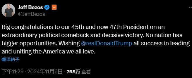除了马斯克外,其他科技大佬也纷纷转变态度,开始支持特朗普。例如,贝索斯在特朗普宣布胜利后就送上了热情的祝贺,并控制《华盛顿邮报》拒绝背书民主党候选人。这一变化表明,科技圈对特朗普的态度已经发生了巨大的转变。