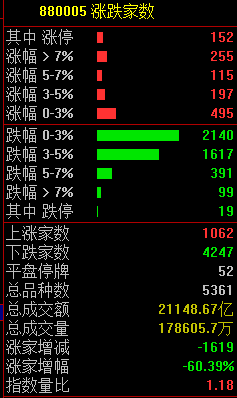 市场涨跌家数方面,呈现普跌格局。共有1062只个股上涨,其中152只个股涨停。然而,下跌的个股数量高达4247只,跌停个股也有19只。