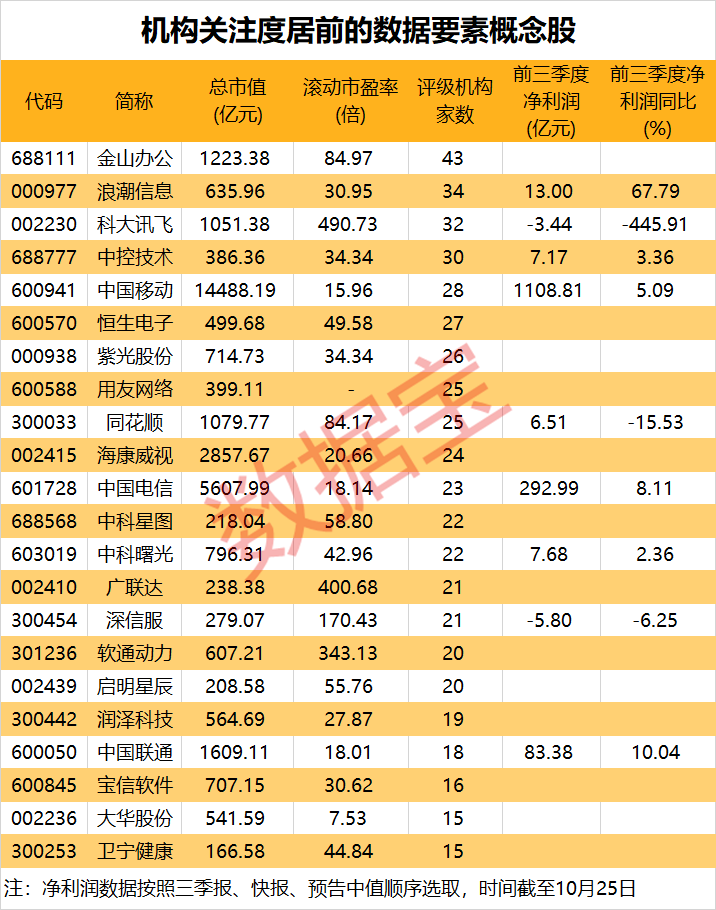 在数据要素概念股中,机构关注度较高的个股包括金山办公、浪潮信息、科大讯飞、中控技术等。其中,浪潮信息与华胜天成合作,打造数据中心智能运营解决方案,已在多个行业取得显著成效。此外,通信三巨头中国移动、中国电信、中国联通前三季度净利润均实现同比增长。