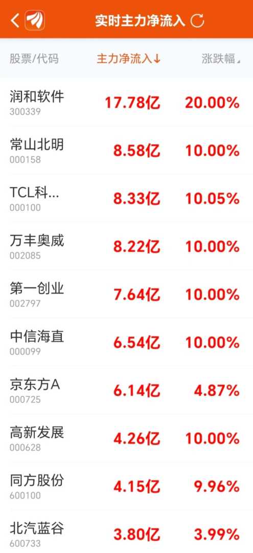 具体来看,东方财富Choice数据显示,10月30日主力净买入前十大个股中,润和软件以17.78亿元的净买入额位居榜首,该股当日更是实现了20CM的涨停;常山北明紧随其后,主力净买入8.58亿元。