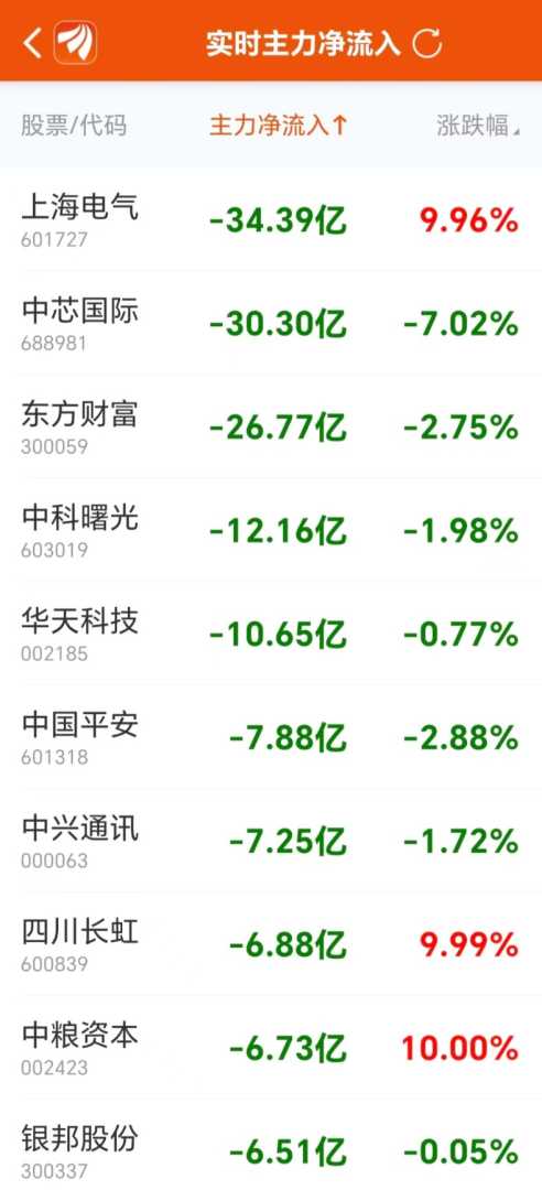 而在主力净卖出方面,上海电气和中芯国际成为前两大净卖出个股。其中,上海电气主力净卖出34.39亿元,中芯国际主力净卖出30.30亿元。