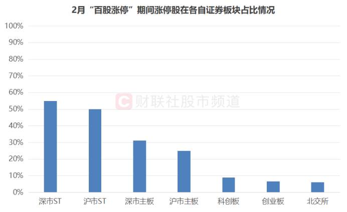 注:2月“百股涨停”期间涨停股在各自证券板块占比情况(2月6日至21日)