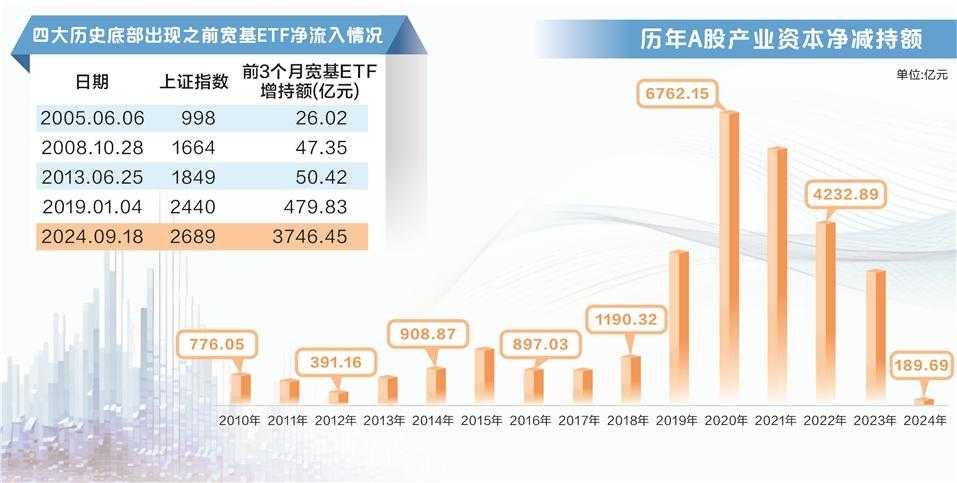 宽基ETF作为市场风向标,其资金流向往往能反映出市场的情绪变化。在今年股市持续走弱的背景下,宽基ETF却呈现出了资金净流入的态势。截至2024年9月18日,此前3个月宽基ETF资金净流入规模远超历史四大底部同期,显示出市场资金对于优质资产的认可。