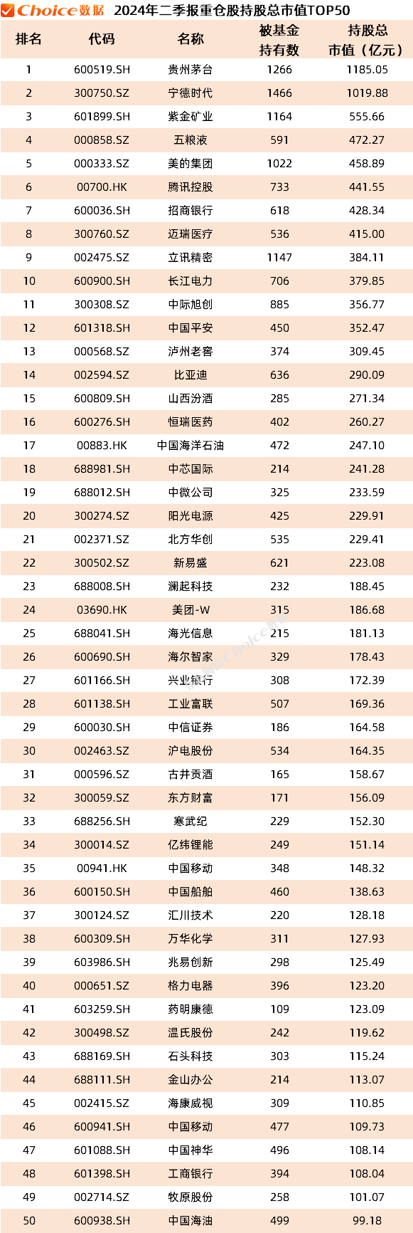 在二季报重仓股持股总市值TOP50榜单中,贵州茅台以1185.05亿元的持股总市值独占鳌头,被1266只基金持有。宁德时代和紫金矿业分别以1019.88亿元和555.66亿元的持股总市值紧随其后。