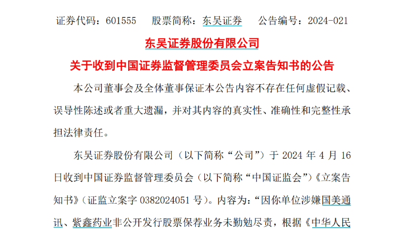 除东吴证券外,中信证券和海通证券也因定增项目被立案。4月12日,中核钛白发布公告称,公司实际控制人因涉嫌违反限制性规定转让中核钛白2023年非公开发行股票、信息披露违法等违法违规行为被证监会立案。同时,中信证券和海通证券也因在相关主体违反限制性规定转让中核钛白非公开发行股票过程中涉嫌违法违规被立案。
