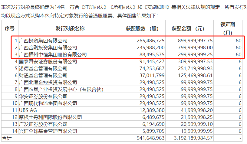 控股股东广西投资集团及其控股子公司中恒集团、广西金投认购金额分别为9亿元、3亿元和8亿元,合计20亿元,并锁定60个月。国泰君安、华安证券、广发证券认购金额分别为3.1亿元、1亿元和2000万元。此外,还有多家基金和外资QFII参与认购。