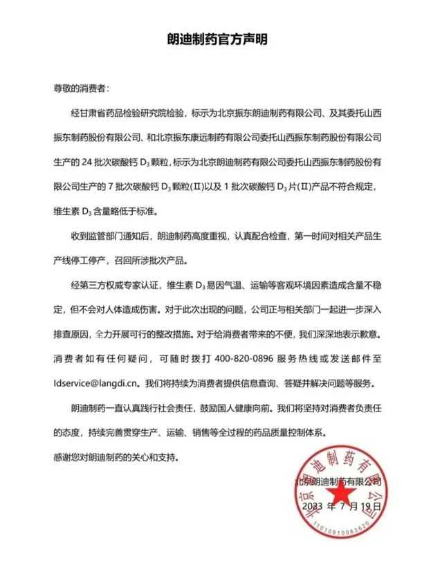 值得注意的是,早在今年7月,国家药监局就发布公告称,朗迪制药等16家企业生产的49批次药品不符合规定,其中朗迪制药的碳酸钙D3产品被点名。当时,朗迪制药已在公众号发布致歉声明。