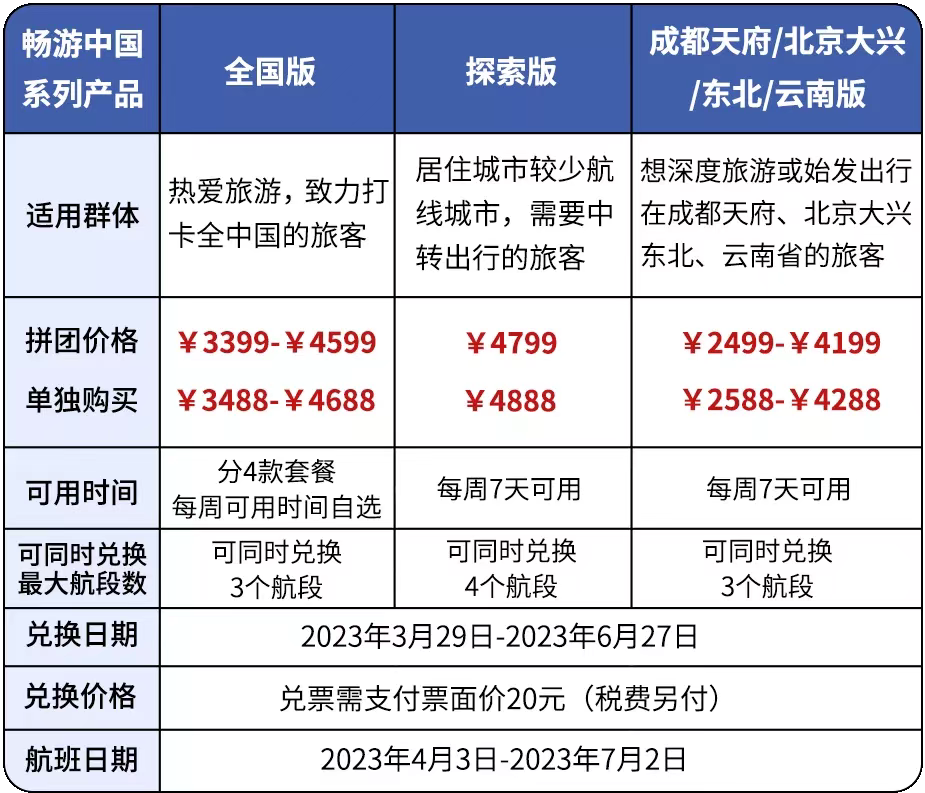 “畅游中国”系列产品对比图,财联社记者截取自南航官方微信。