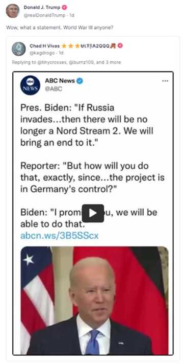 在此背景下,美国前总统特朗普在社交平台Truth Social上活跃发声,转发了一则网友推文,该推文引用了2月美国媒体的报道,当时拜登表示,如果俄罗斯发起冲突,北溪2号管道将不复存在,美国有能力终结它。特朗普借此暗示,北溪管道泄漏可能与拜登有关,而这条2月的新闻便是证据之一。
