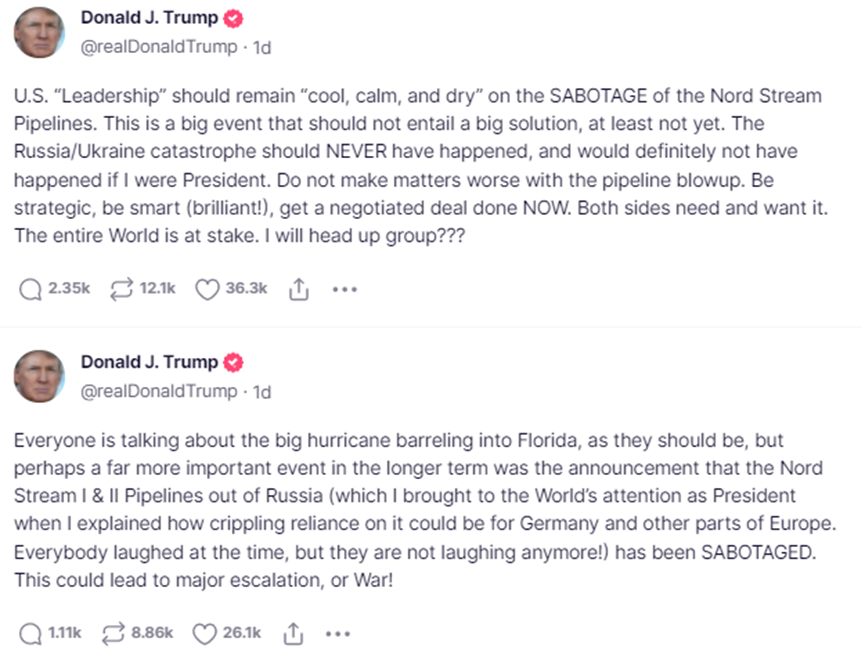 特朗普在北溪管道泄漏事件上多次发表评论,认为比起近期飓风伊恩对美国的打击,民众更应关注北溪管道的新闻。此次破坏可能导致德国及欧洲对俄罗斯能源的依赖问题进一步升级,甚至引发战争。