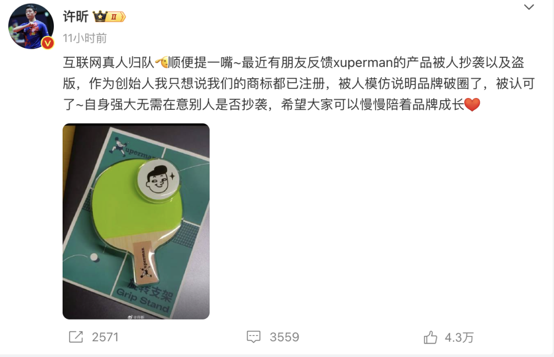乒乓球名将许昕回应自创品牌Xuperman被抄袭,表示商标已注册,品牌破圈被认可,自身强大无需在意抄袭。