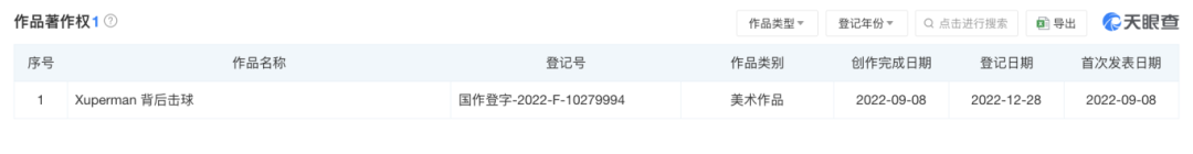 值得一提的是,上海许昕体育文化发展有限公司还投资成立了上海许昕背后击球体育文化发展有限公司,后者正是“许昕体育Xuperman”的关联公司。在知识产权方面,上海许昕体育文化发展有限公司还登记了“Xuperman 背后击球”的美术作品著作权。