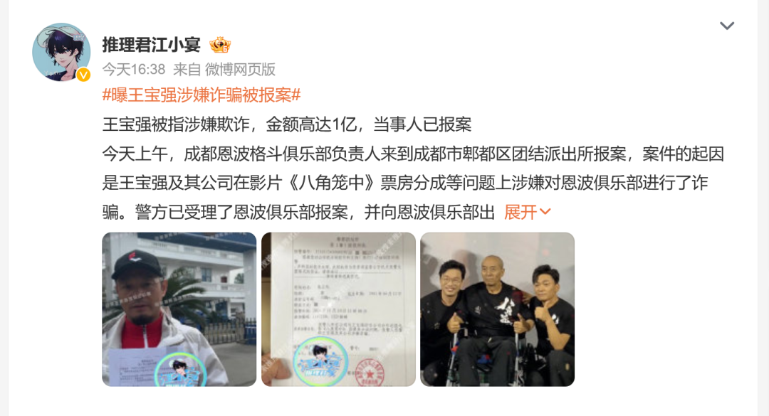 11月21日,知名男星王宝强被曝涉嫌欺诈,相关话题#王宝强被举报涉嫌欺诈#迅速冲上热搜,引起社会广泛关注。据《大河报》报道,有博主发文称,某格斗俱乐部负责人报案称,在合作拍摄电影《八角笼中》时,俱乐部全力支持王宝强,投入高达百万元,但承诺的票房分成未兑现,导致俱乐部经营困难。