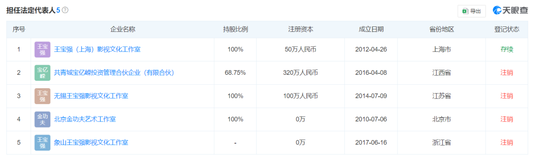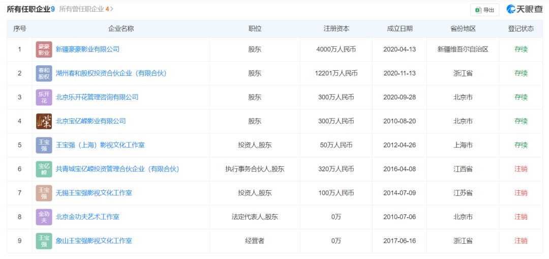 据天眼查App显示,王宝强名下共关联9家企业,其中5家为存续状态,包括王宝强(上海)影视文化工作室、北京宝亿嵘影业有限公司等,商业版图涉及影视、股权投资。