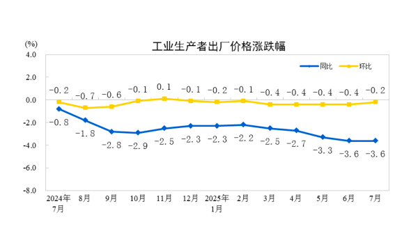 而受季节性因素叠加国际贸易环境不确定性影响,工业生产者出厂价格指数(PPI)环比下降0.2%,降幅比上月收窄0.2个百分点,同比下降3.6%,降幅与上月相同。