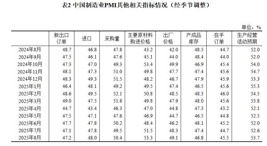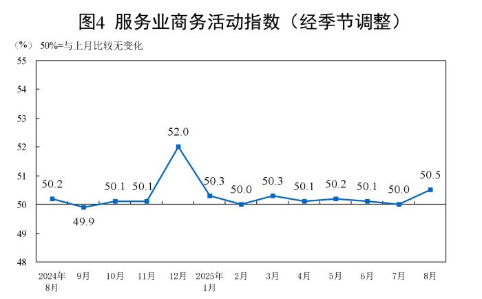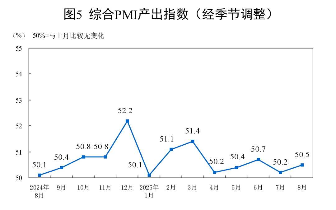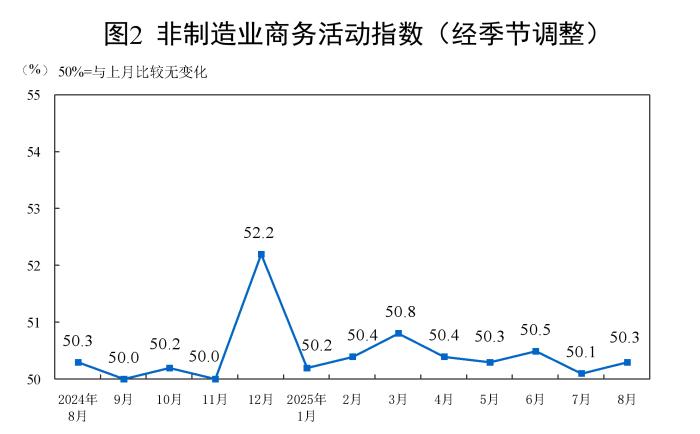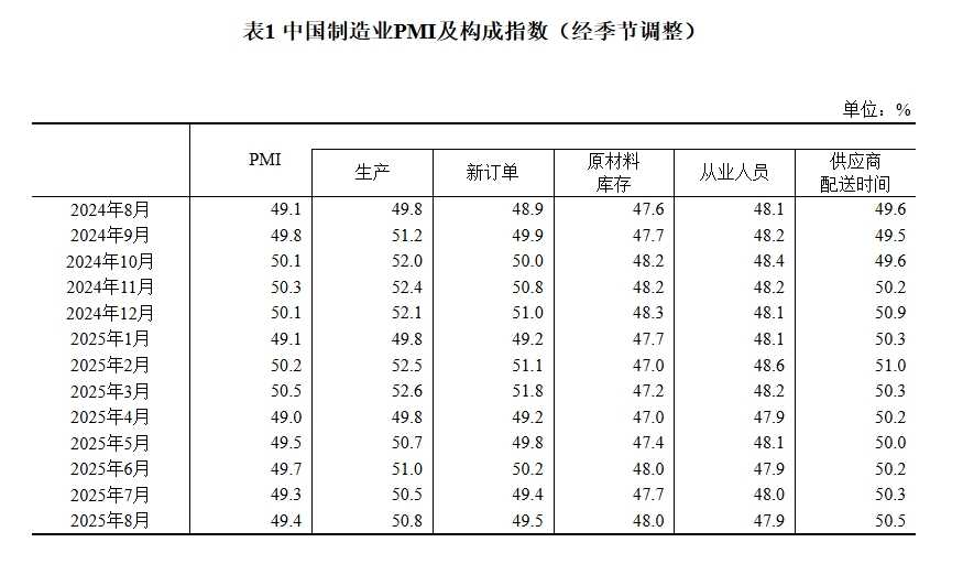 2025年8月中国采购经理指数显示,制造业PMI为49.4%,较上月上升0.1个百分点;非制造业商务活动指数为50.3%,高于临界点;综合PMI产出指数为50.5%,表明企业生产经营活动总体扩张有所加快。