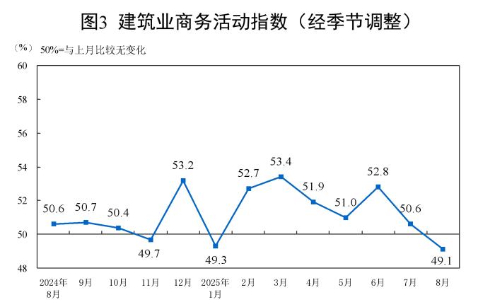 8月份,非制造业商务活动指数为50.3%,比上月上升0.2个百分点,高于临界点,非制造业继续保持扩张态势。分行业看,建筑业商务活动指数为49.1%,比上月下降1.5个百分点;服务业商务活动指数为50.5%,比上月上升0.5个百分点。从行业看,铁路运输、水上运输、航空运输、电信广播电视及卫星传输服务、资本市场服务等行业商务活动指数位于60.0%以上高位景气区间;零售、房地产等行业商务活动指数均低于临界点。