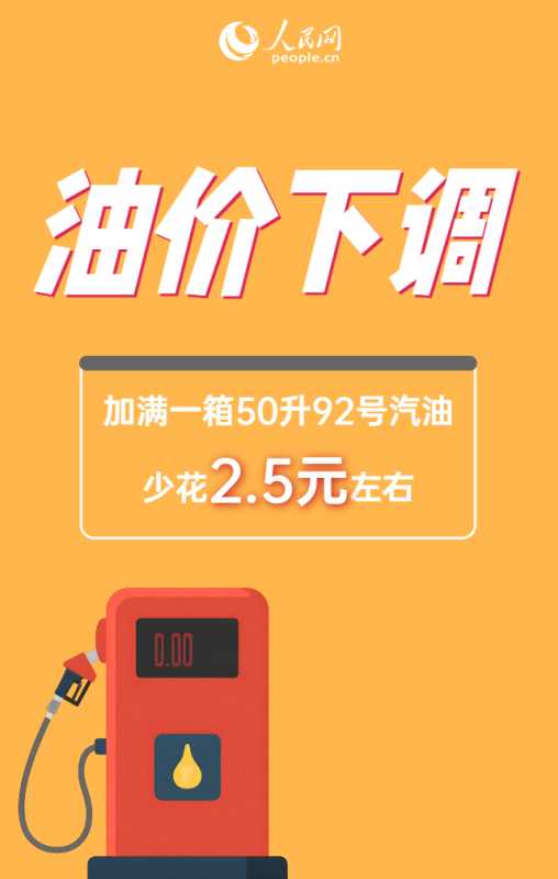 人民网北京11月24日电 (记者罗知之)据国家发展改革委网站消息,近期国际市场油价波动运行,根据11月24日的前10个工作日平均价格与上次调价前10个工作日平均价格对比情况,按照现行成品油价格机制,自11月24日24时起,国内汽、柴油价格(标准品,下同)每吨分别降低70元和65元。此次国内汽柴油价格下调,加满一箱50升的92号汽油,将少花2.5元左右。