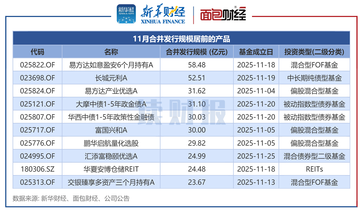 基金公司方面,易方达基金、华夏基金、天弘基金等公司11月发行基金数量较多,包括易方达科技先锋、华夏安博仓储REIT、天弘匠心回报等产品。