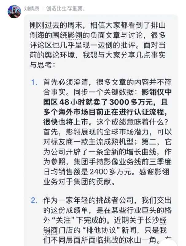 公开信中,刘靖康开篇即回应市场关切:影翎A1在中国区上市48小时销售额突破3000万元,多个海外市场认证流程已进入尾声,即将开启全球销售。刘靖康强调,这一成绩不仅对标友商成熟机型的市场表现,更验证了全景无人机作为影石第二增长曲线的战略价值。作为参照,集团手持影像业务线前三季度日均销售额是2400多万元。