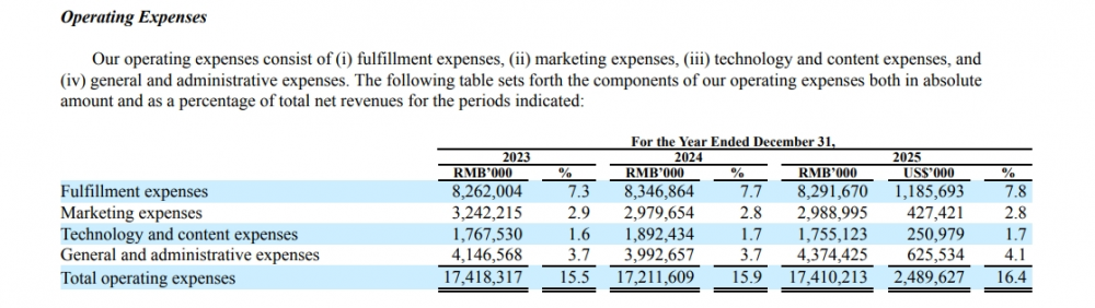 财报数据还显示,唯品会的履约费用率从2020年6.8%已经攀升到2025年7.8%。