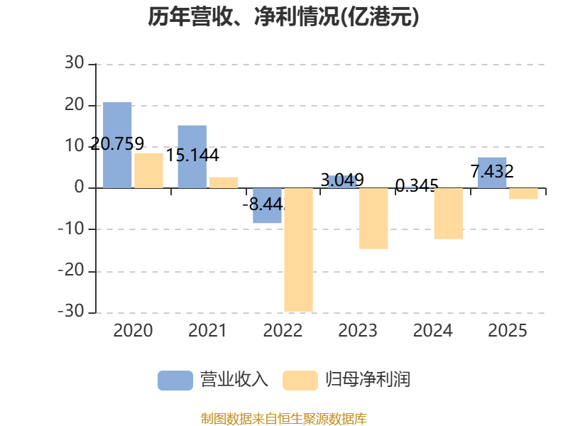 2025年,公司经营活动现金流净额为-3.83亿港元,同比减少14.2亿港元;筹资活动现金流净额6.7亿港元,同比增加32.17亿港元;投资活动现金流净额-5485.2万港元,上年同期为14.75亿港元。