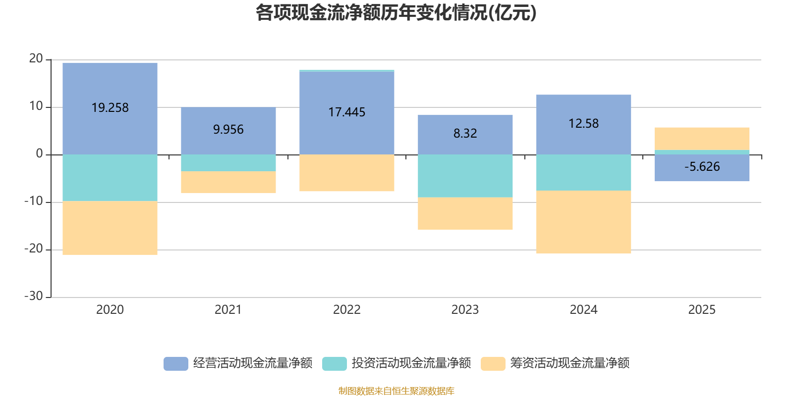 2025年,公司经营活动现金流净额为-5.63亿元,同比减少18.21亿元;筹资活动现金流净额4.69亿元,同比增加17.92亿元;投资活动现金流净额9696.6万元,上年同期为-7.61亿元。