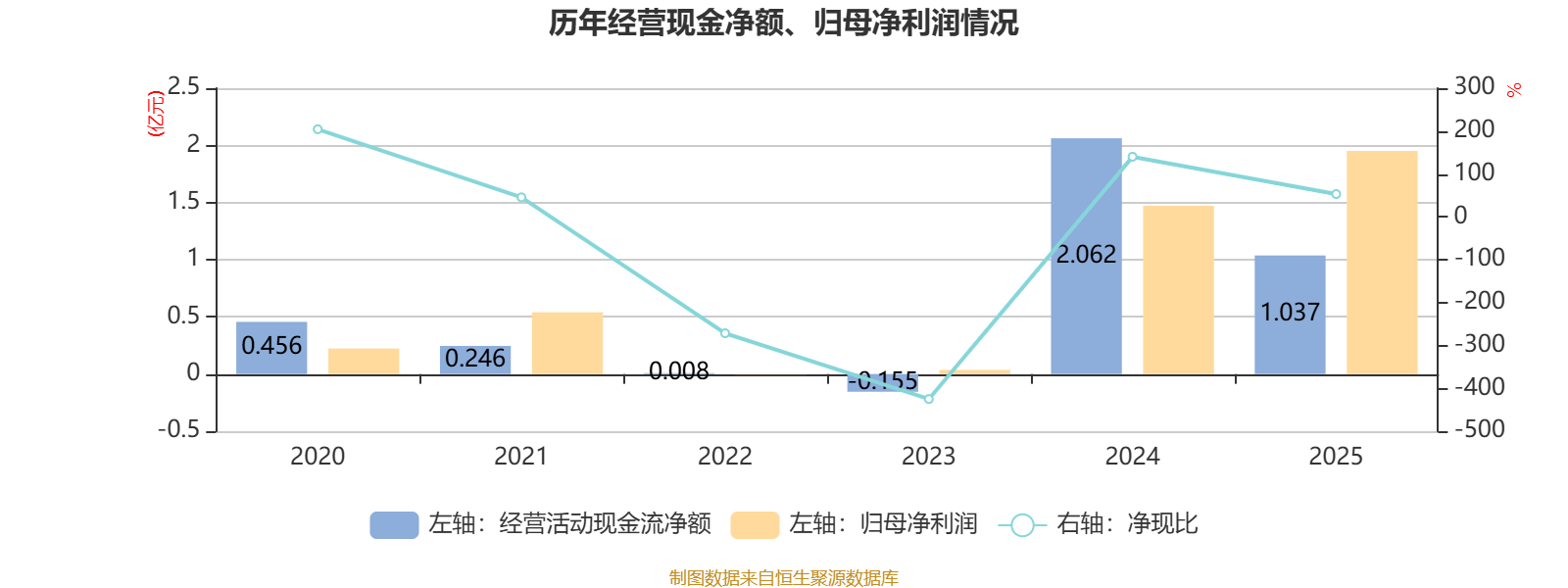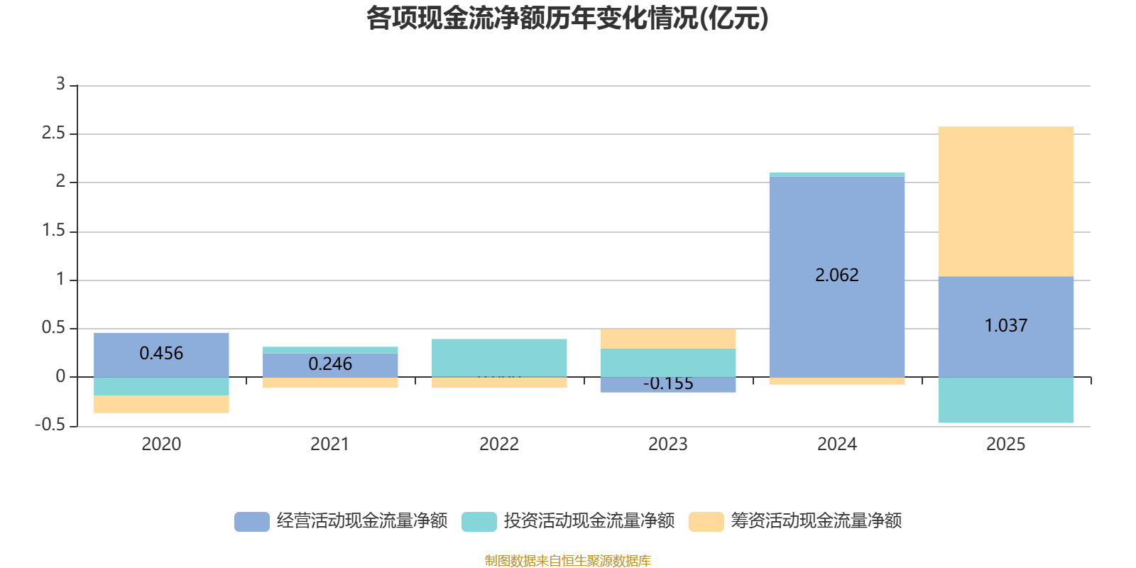 2025年,公司经营活动现金流净额为1.04亿元,同比下降49.72%;筹资活动现金流净额1.54亿元,同比增加1.61亿元;投资活动现金流净额-4673.1万元,上年同期为423万元。