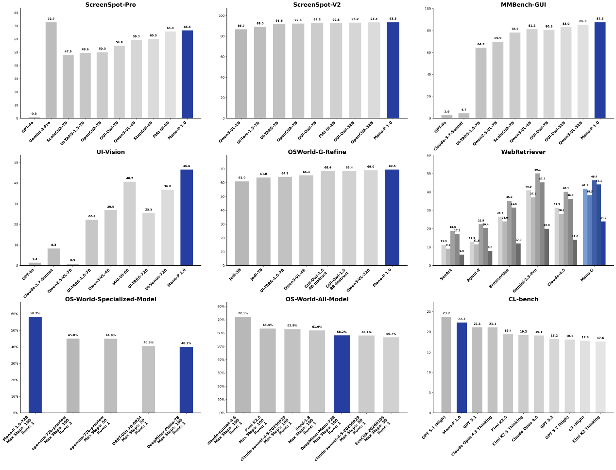 Mano-P 1.0-72B在OSWorld基准测试中取得58.2%成功率,在所有专用GUI智能体模型中排名全球第一,领先第二名opencua-72b(45.0%)达13.2个百分点。在WebRetriever Protocol I测试中,Mano-P取得41.7 NavEval分数,超越Gemini 2.5 Pro Computer Use(40.9)。