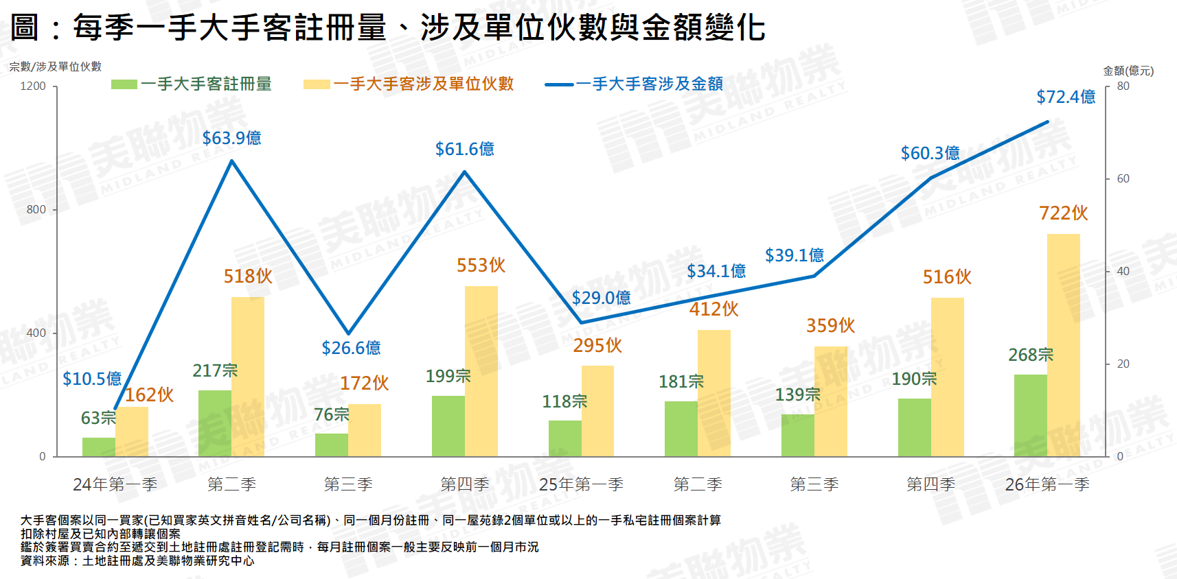 美联物业研究中心综合香港土地注册处的资料统计显示,已知的一手大手客(即同一买家于同一月份及同一新盘购入多于一个单位)于今年一季度共录得268宗,环比大升约41.1%;一手大手客共购入722个单位,环比涨约4成;投入资金方面,上述单位共涉及约72.4亿港元,按季度来说升约2成,可见无论“量额”均同创“撤辣”(撤销或放松为抑制楼市过热而实施的调控措施)后新高。