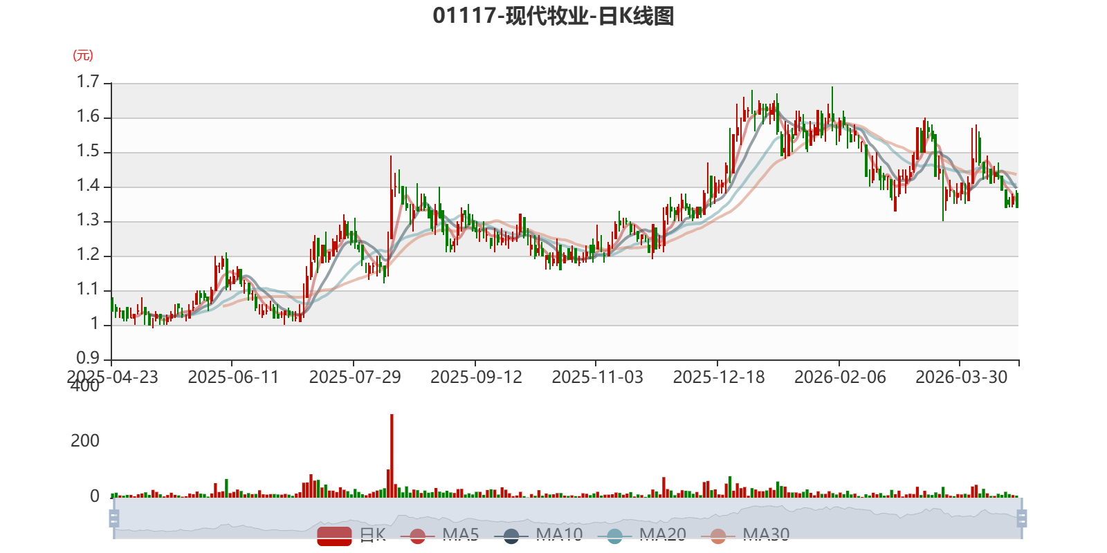 以4月23日收盘价计算,现代牧业目前市净率(TTM)约1.16倍,市销率(TTM)约0.76倍。