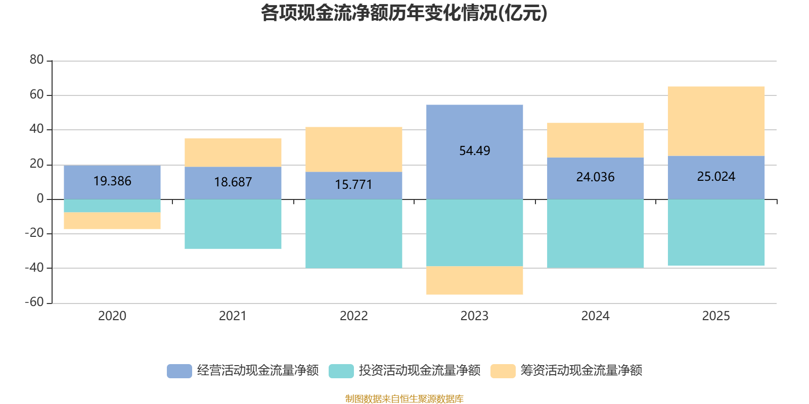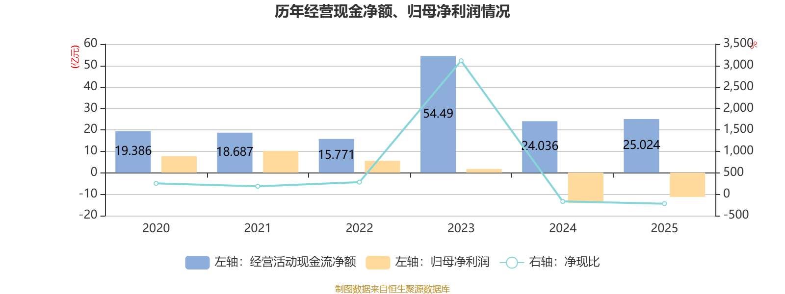 2025年,公司经营活动现金流净额为25.02亿元,同比增长4.11%;筹资活动现金流净额40.02亿元,同比增加20亿元;投资活动现金流净额-38.41亿元,上年同期为-39.68亿元。