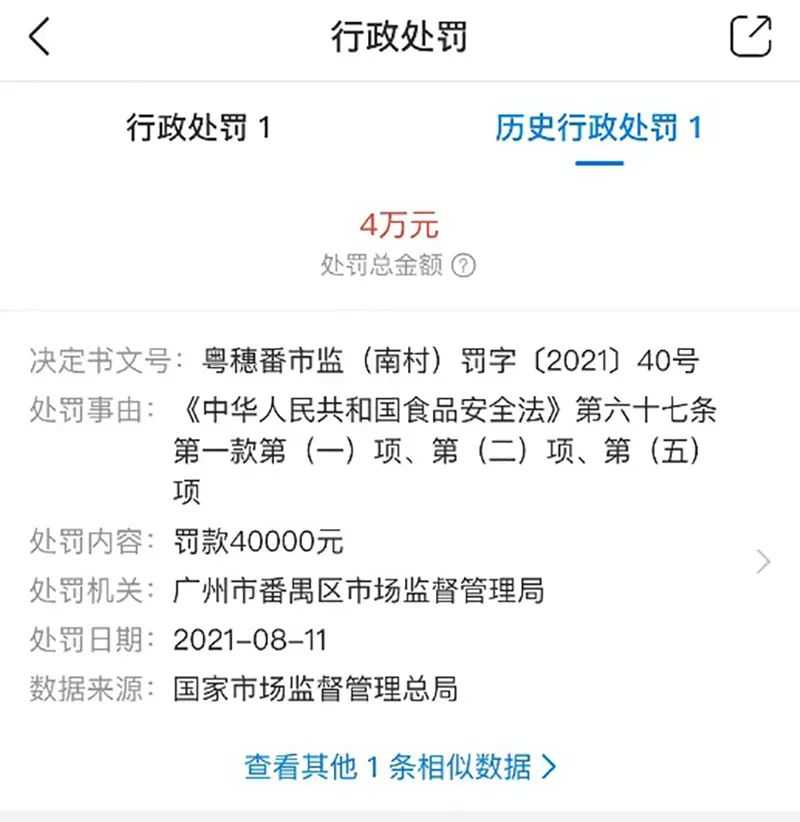 值得注意的是,这并非该公司首次受到处罚。早在2021年8月,该公司就曾因违反《中华人民共和国食品安全法》的相关规定,被广州市番禺区市场监督管理局罚款4万元。