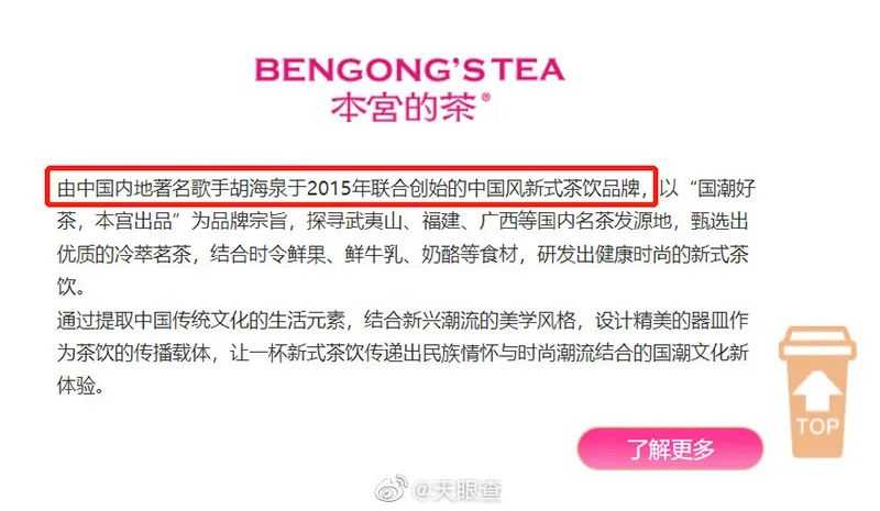 而“本宫的茶”与胡海泉的关系也备受关注。据该品牌加盟官方网站显示,胡海泉为该品牌的联合创始人,并大量使用带有胡海泉等明星肖像的海报进行宣传,甚至打出了“半个娱乐圈都捧在手心”的宣传语。