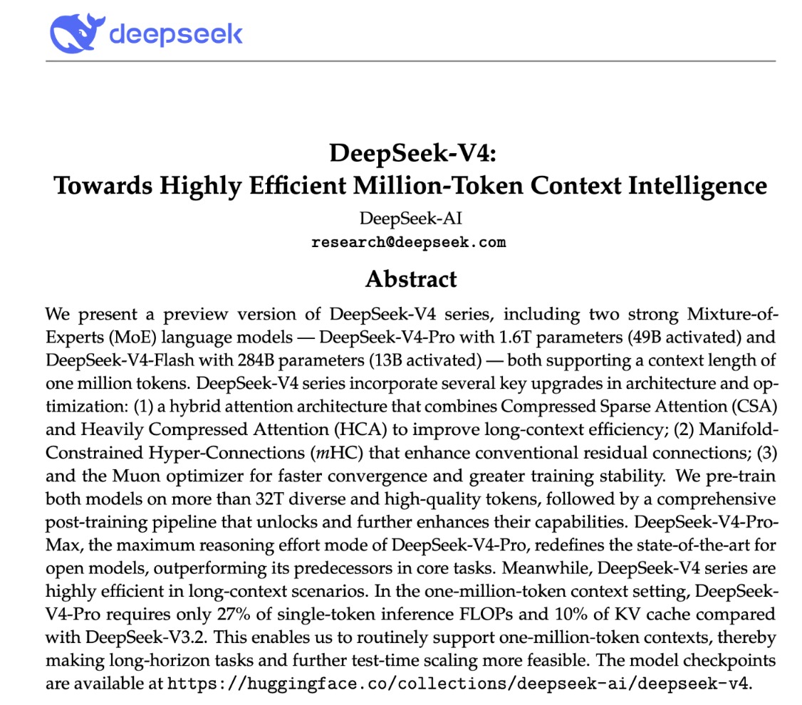 相比 DeepSeekV3 架构,DeepSeekV4 系列保留 DeepSeekMoE 框架与多令牌预测(MTP)策略,并引入多项关键架构与优化创新:混合注意力架构大幅提升长上下文处理效率,流形约束超连接(mHC)增强了传统残差连接,提升信号传播稳定性,而Muon 优化器加快收敛速度,提升训练稳定性。