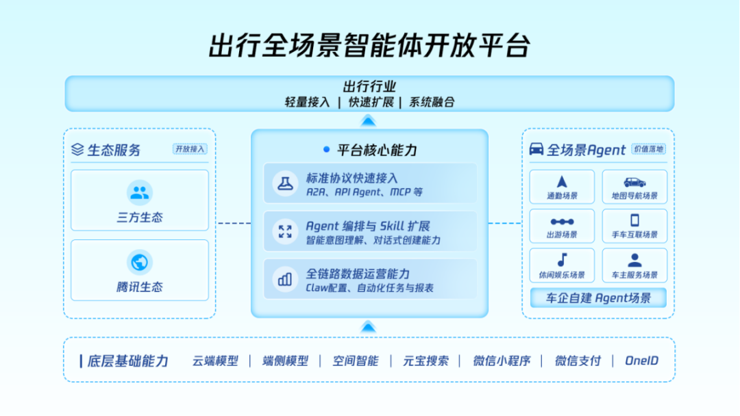 在汤道生做出上述判断的同一场活动上,腾讯正式面向汽车行业发布了“出行全场景智能体开放平台”,以及基于该平台构建的七大核心场景智能体。