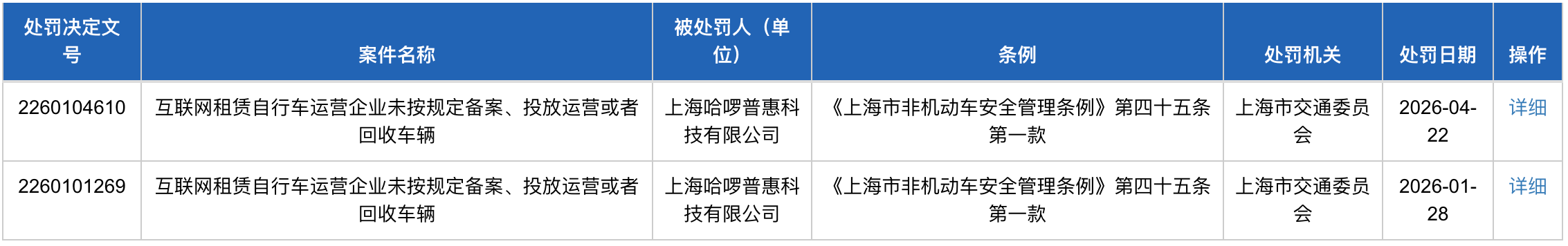 4月24日消息,据上海市交通委网站,上海哈啰普惠科技有限公司(下称哈啰)因“互联网租赁自行车运营企业未按规定备案、投放运营或者回收车辆”被上海市交通委员会罚款10万元,处罚日期显示为4月22日。今年1月,哈啰因相同事由被罚款10万元。