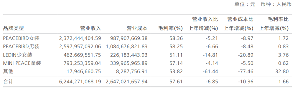 财报显示,PEACEBIRD女装营收23.72亿元,同比下降5.21%;PEACEBIRD男装营收25.98亿元,同比下降6.66%。两大核心品牌合计贡献总营收的近八成,但降幅虽较2024年有所收窄,仍未止住下滑势头。