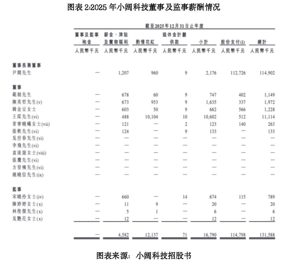从薪酬来看,2025年小阔科技董事及高管薪酬总额(含股份支付)为1.32亿元,较2024年激增827.92%,远超同期营收82.5%的增幅。其中原董事王琛近三年薪酬位居董监首位。2023—2025年(下称“报告期”),王琛的薪酬(剔除股份支付)分别为306.1万元、798.9万元、1060.2万元,逐年走高,远高于CEO尹阔同期的薪酬(剔除股份支付)。