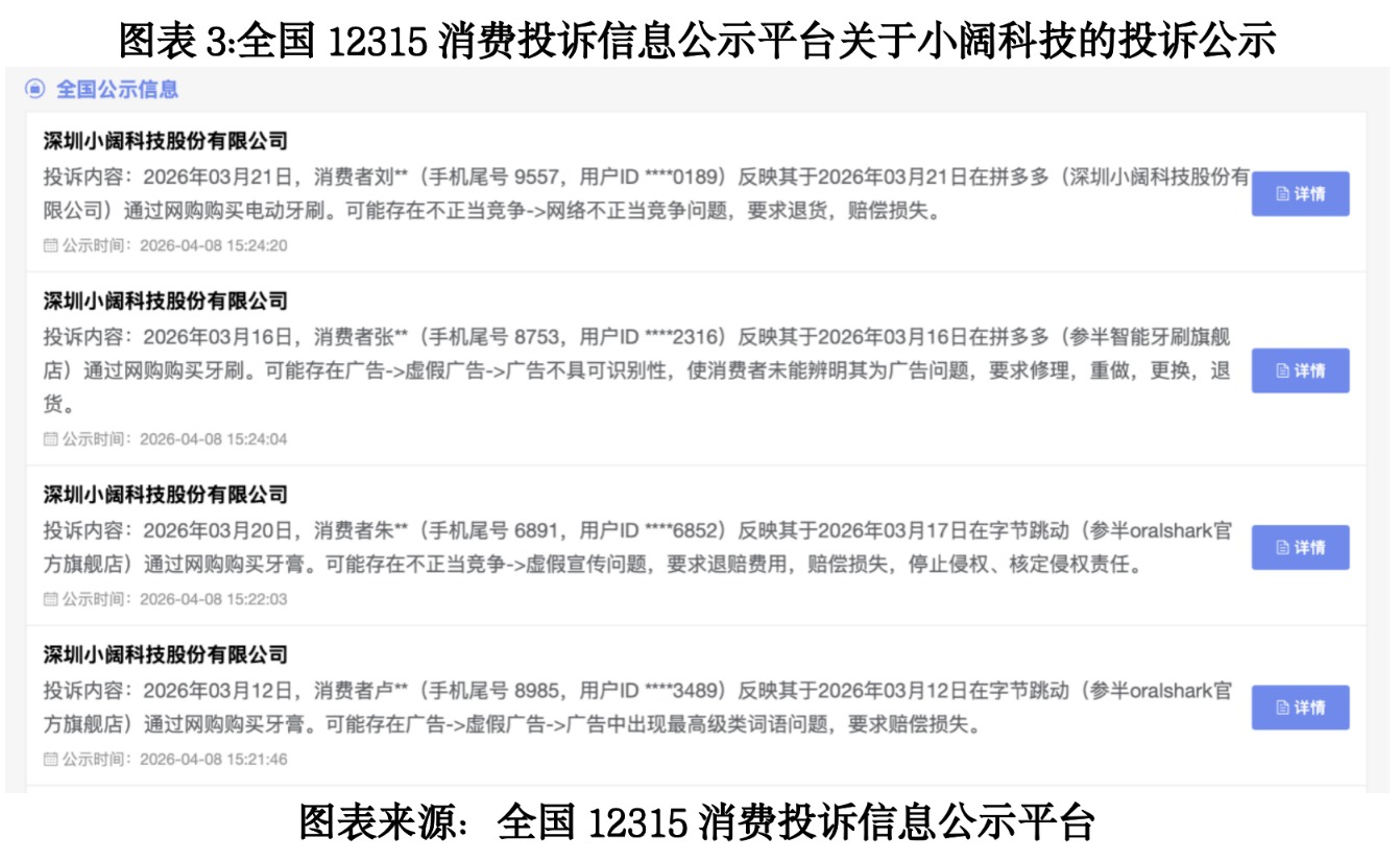 在新浪旗下消费者服务平台“黑猫投诉”上,关于“参半牙膏”的投诉接近200条,涉及“牙膏内存在塑料片”“虚假宣传、诱导消费”等。另外,全国12315消费投诉信息公示平台上,也有多条关于小阔科技的投诉,涉及“网络不正当竞争”“虚假宣传”“广告中出现最高级类词语”等问题。