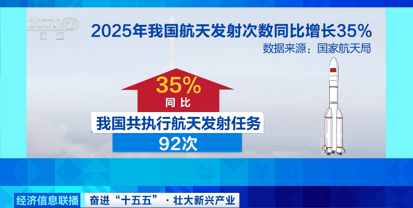 国家航天局数据显示,2025年,我国航天发射92次,比2024年增长35%。其中,商业航天发射50次,入轨的商业卫星超310颗,创历史新高,发射频次与质量稳步提升。